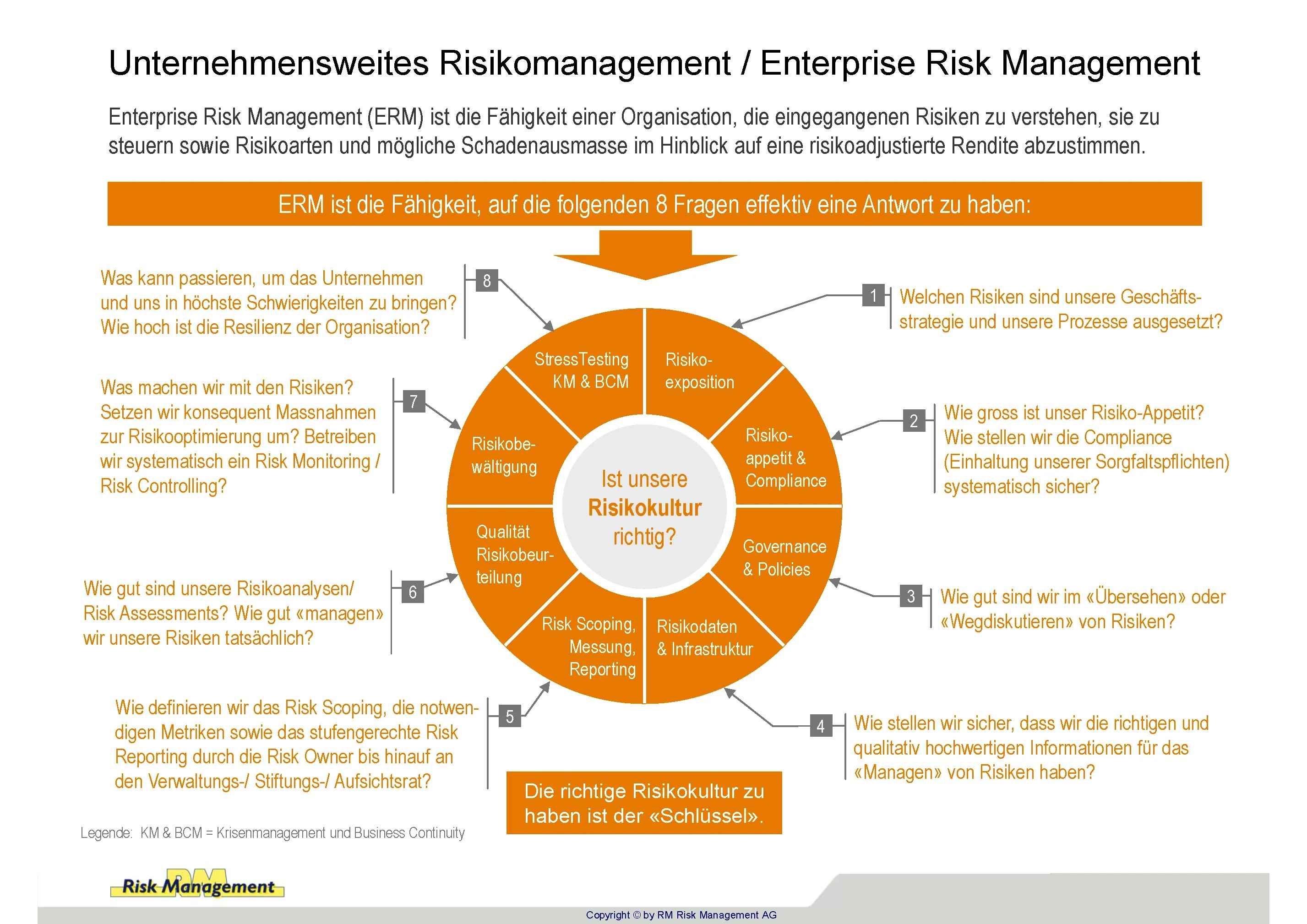 Dieses PDF stellt acht Kernfragen des Enterprise Risk Management vor. Sie behandeln Risikokultur, Risikoappetit, Governance, Datenqualität, Risikoanalyse, Risikobewältigung sowie Resilienz und dienen als Selbstcheck für Organisationen.