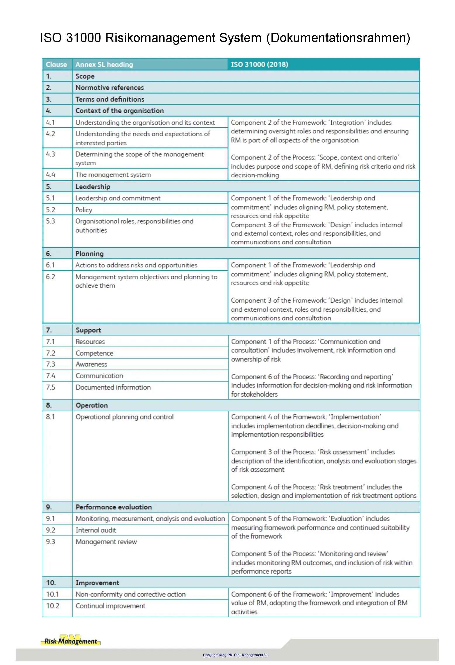 Das PDF bietet einen Dokumentationsrahmen für Risikomanagement nach ISO 31000. Es zeigt die Struktur und Anforderungen auf, die für die Implementierung eines systematischen und standardkonformen Risikomanagementsystems notwendig sind.