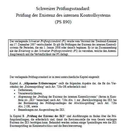 Dieses PDF erläutert den Schweizer Prüfungsstandard PS 890 zur Prüfung der Existenz interner Kontrollsysteme. Es beschreibt Verantwortlichkeiten von Verwaltungsrat, Geschäftsleitung und Revisionsstelle sowie Prüfungsumfang und -methoden.