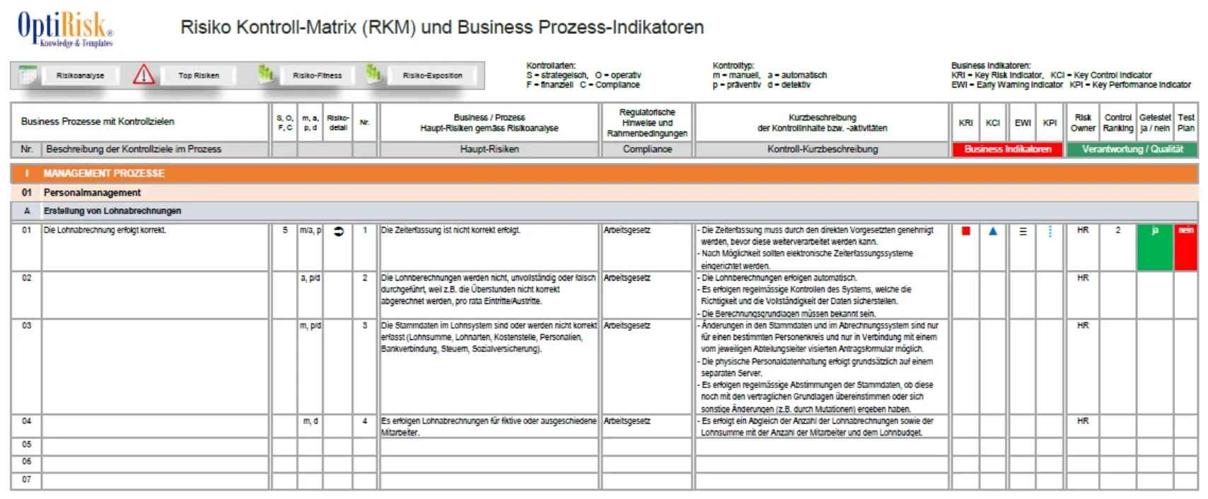 Dieses Dokument stellt eine Risiko-Kontroll-Matrix (RKM) dar. Sie verknüpft Geschäftsprozesse mit Risiken, Kontrollzielen und -massnahmen sowie Verantwortlichkeiten. Ergänzt wird sie durch Indikatoren wie KRI, KCI, EWI und KPI.