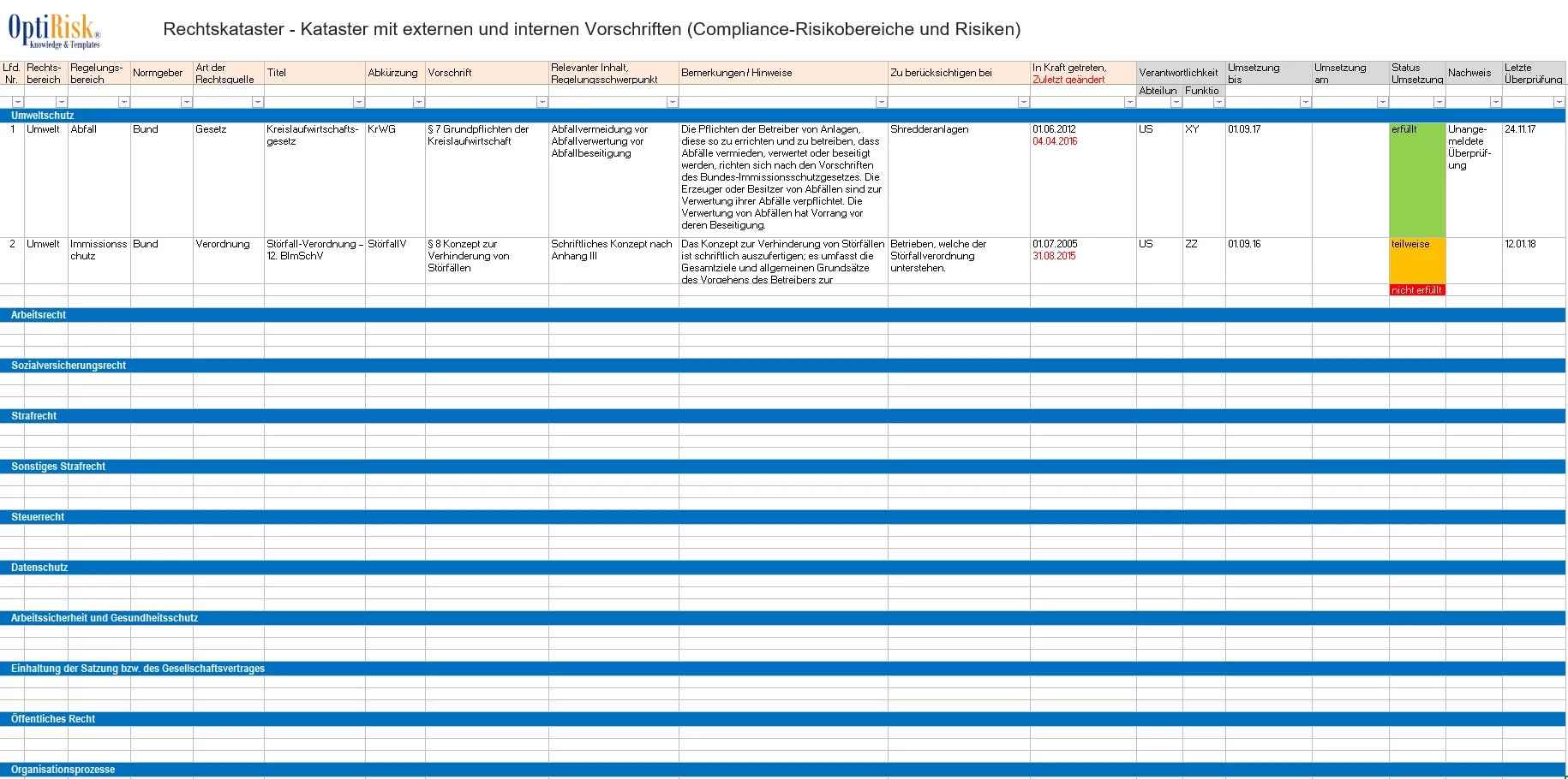 Das PDF zeigt ein Rechts- und Risikokataster. Es listet relevante Vorschriften, Regelungen und interne sowie externe Anforderungen auf. Ziel ist es, Compliance- und Risikobereiche systematisch zu erfassen, zu bewerten und den Umsetzungsstatus zu dokumentieren.