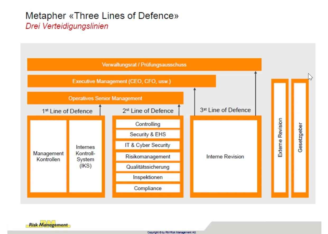 Das Dokument erklärt das Modell der „Three Lines of Defence“. Es zeigt die Rollen von operativem Management, Controlling, Risikomanagement, Compliance und interner Revision bei der Sicherstellung von Governance, Risikokontrolle und Überwachung.
