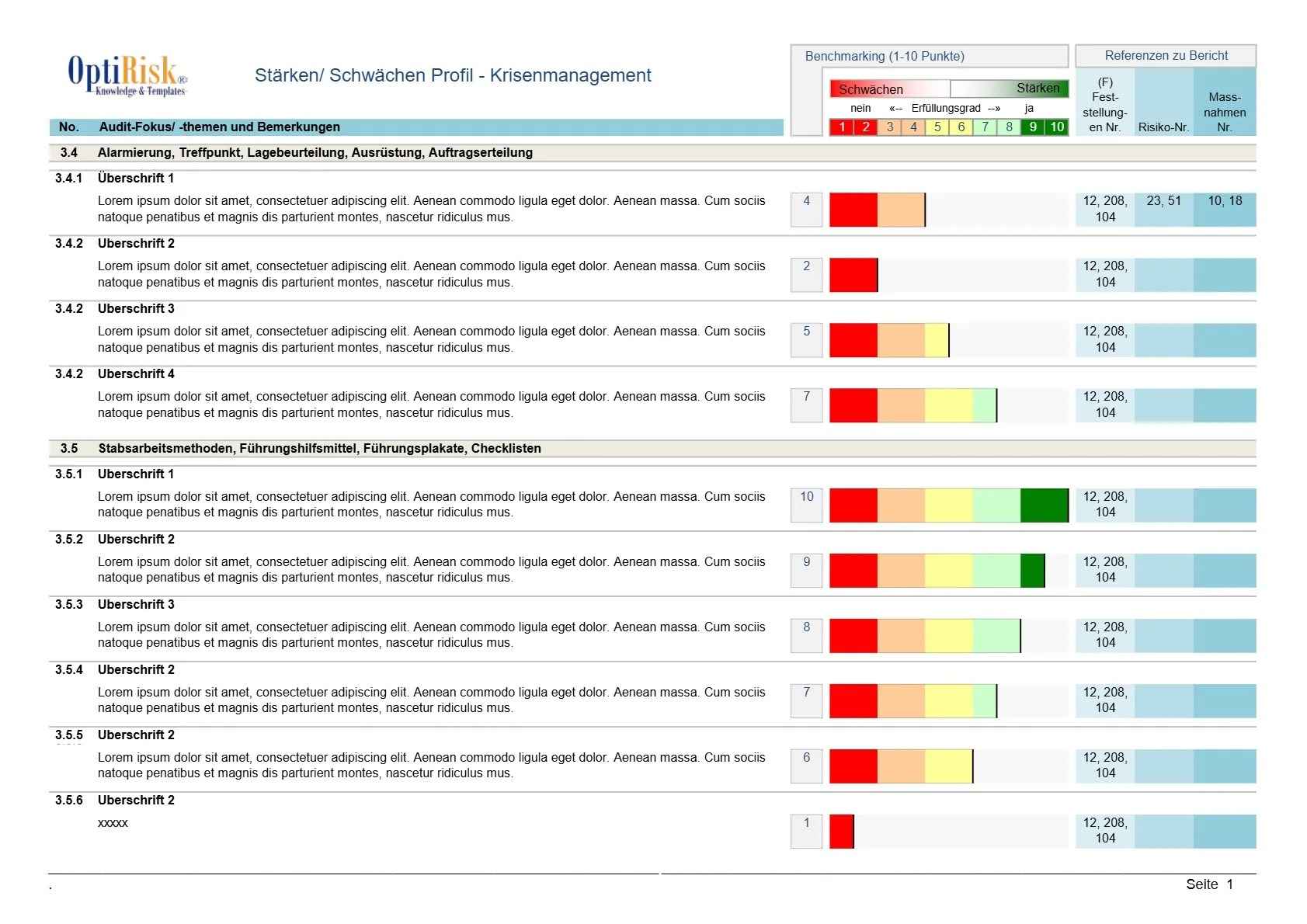 Das Dokument enthält ein Audit-Tool für Krisenmanagement-Übungen. Es bietet Benchmarking-Tabellen zur Bewertung von Alarmierung, Lagebeurteilung, Stabsarbeit und Führungsmethoden. Das Stärken-Schwächen-Profil unterstützt Organisationen bei der Optimierung ihres Krisenmanagements.