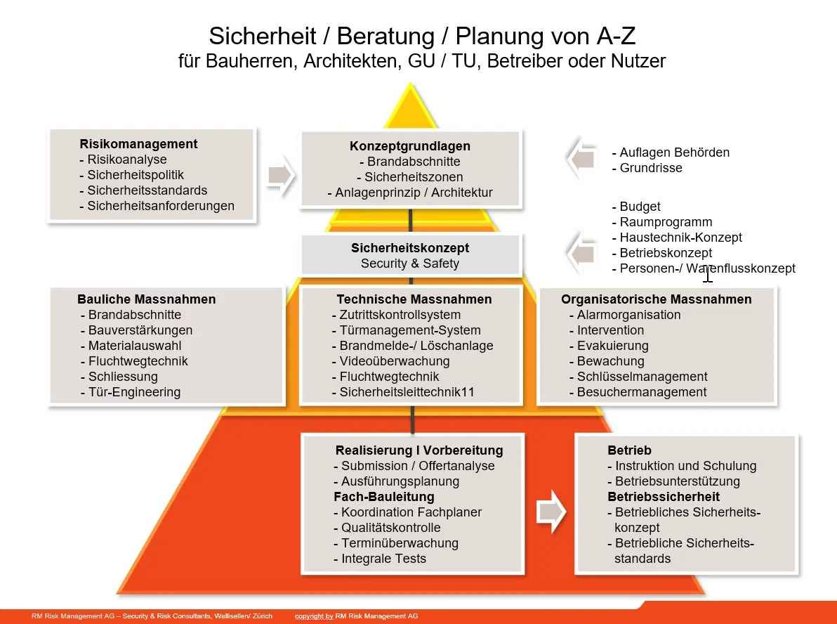 Das PDF beschreibt Sicherheitsberatung und -planung von A bis Z. Abgedeckt sind organisatorische, technische und bauliche Massnahmen sowie Realisierung und Betrieb. Zielgruppe sind Bauherren, Architekten, Betreiber und Nutzer.